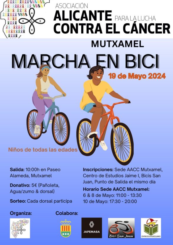 A les 10.00 hores s’iniciarà també la Marxa Ciclista amb finalitats benèfics organitzada al costat de l’Associació Contra el Càncer Mutxamel-Sant Joan. El recorregut, que es realitzarà pels carrers del municipi, té un total de 5 km i és accessible per a totes les edats. Per a participar és necessària una inscripció prèvia amb un donatiu de cinc euros que podrà realitzar-se en la seu d’aquesta entitat situada en la C/Verge del Loreto, 7 el divendres 10 de maig de 17.30 a 20.00 hores i el mateix diumenge abans d’iniciar el recorregut.
