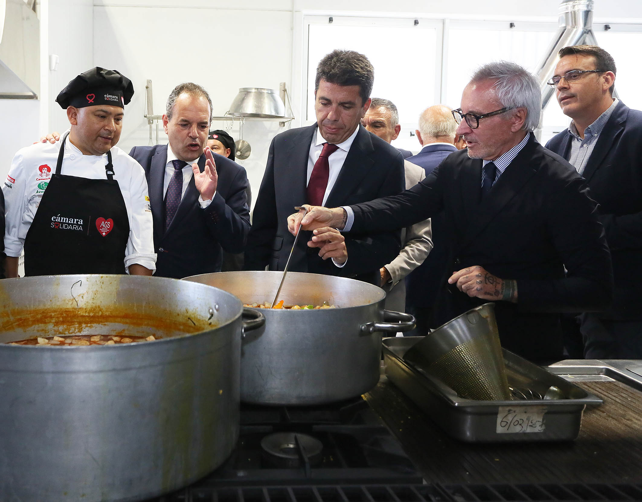 Mazón ha recorrido, acompañado por el presidente de la Cámara, Carlos Baño, el presidente de AGS, Jesús Navarro, el alcalde de la localidad y diputado provincial, Sebastián Cañadas, y el conseller de Hacienda, Arcadi España, las nuevas cocinas y las áreas de formación de esta entidad solidaria que nació hace tres años con el objetivo de ayudar a las familias afectadas por la crisis del coronavirus y que en todo este tiempo ha facilitado, además, la inserción laboral de más de 700 jóvenes en riesgo de exclusión social a través de acciones formativas.