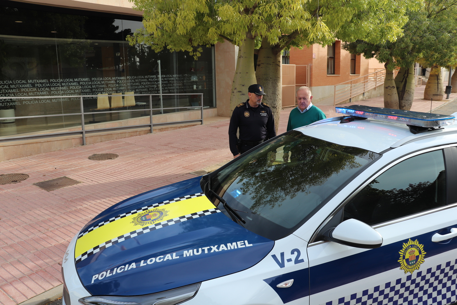 El intendente jefe de la Policía local, Carlos Pomares, ha dado a conocer esta mañana al alcalde de Mutxamel y concejal de Seguridad Ciudadana, Sebastián Cañadas, las características del vehículo, marca KIA, dotado con todos los elementos y distintivos luminosos necesarios para realizar los servicios asignados a los agentes locales.