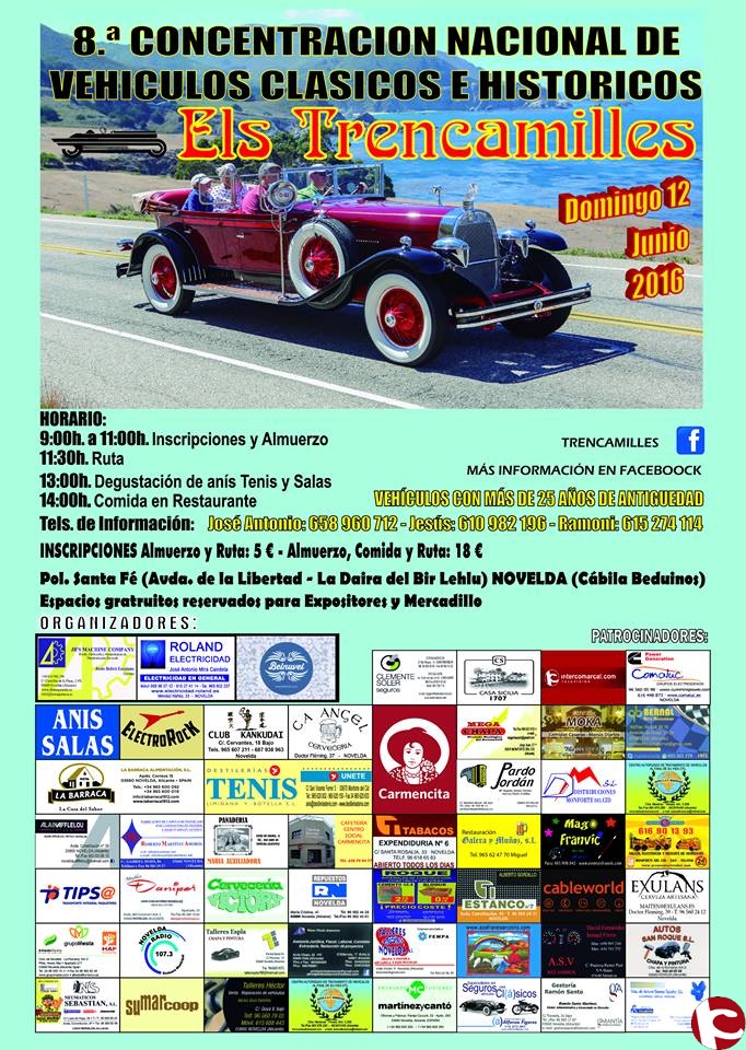 El domingo, 12 de junio, se celebró en Novelda una nueva edición, y ya van 8, de Els Trencamilles, la Concentración Nacional de Vehículos Clásicos e Históricos. La cita es en el polígono Santa Fe, en la Avenida de la Libertad. El evento lo organiza la Cábila Beduinos.