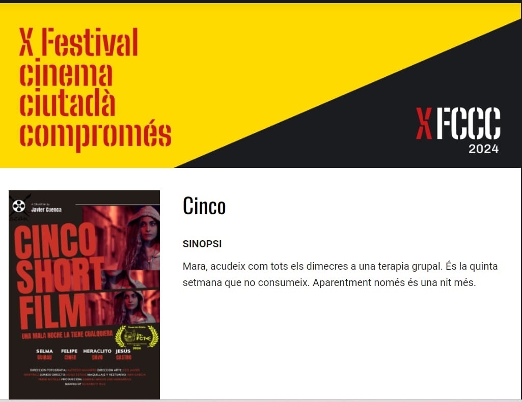 Además el cortometraje “Cinco” ha sido seleccionado también en el mencionado Festival, donde han participado personas integrantes de “La Asociación de Cine y Arte de Novelda (ACAN)”, equipo formado por Javier Cuenca, guion y dirección; Alfredo Navarro, fotografía; Francisco Javier Martínez, arte; Hugo Esteve, sonido; Ana García e Irene Motilla, peluquería y maquillaje; Zoe Margarita y Gabriel Bravo en producción; Selma Guirau actriz principal; Felipe Giner, Heráclito Davó y Jesús Castro, entre otros actores de reparto.