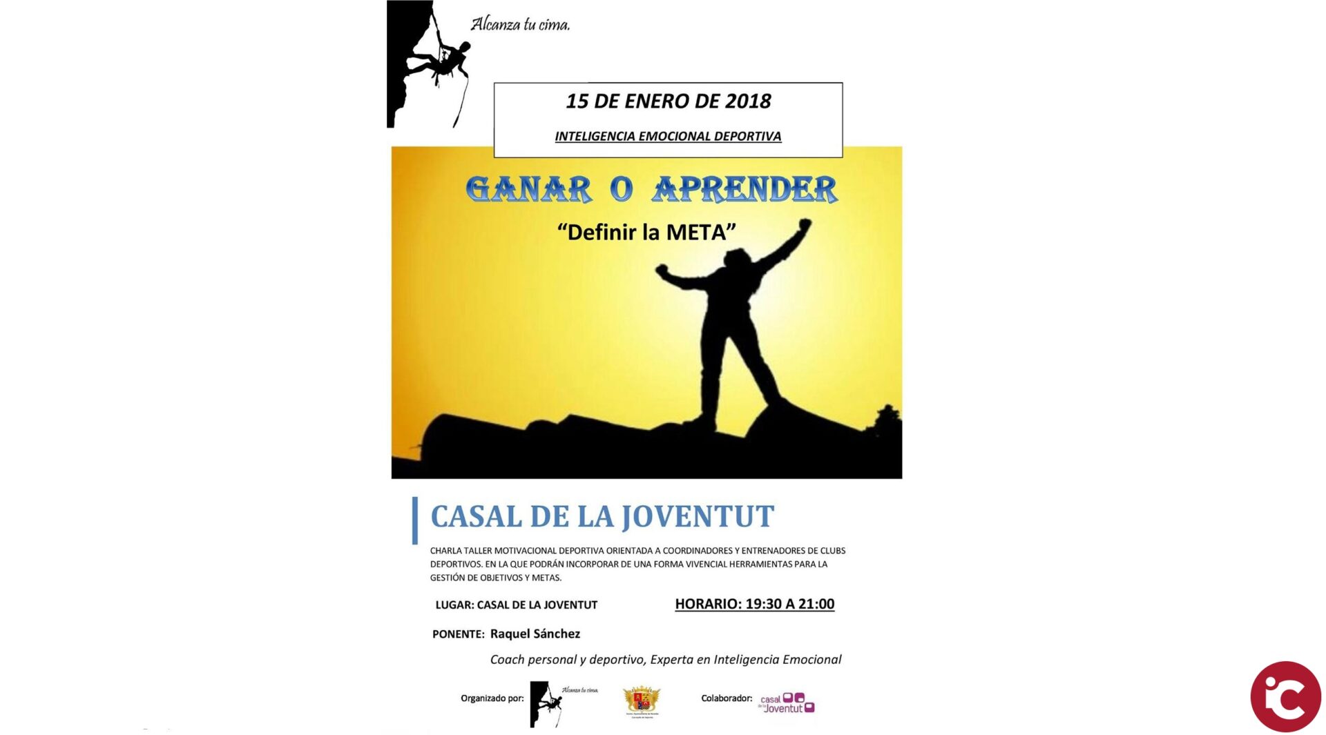 El grupo de formación Alcanza Tu Cima será el encargado de desarrollar la charla-taller que, con el título Definir la Meta, orientará a coordinadores y entrenadores de clubs deportivos sobre la adquisición de herramientas para la gestión de objetivos y metas, según señaló el concejal de Deportes, Jordi Miralles. La ponente, Raquel Sánchez, experta en inteligencia emocional y coach personal y deportivo, explicó que la actividad de formación se centra en la automotivación y añadió que se trata de una parte del proyecto Ganar o Aprender, en el que se trabajan los cinco pilares de la inteligencia emocional.