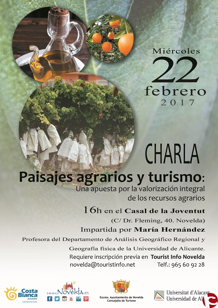 La Concejalía de Turismo del ayuntamiento de Novelda organiza para el miércoles 22 de febrero a las 16h en el Casal de la Joventut (Dr. Fleming, 40) la charla  «Paisajes agrarios y turismo: una apuesta por la valorización integral de los recursos agrarios».