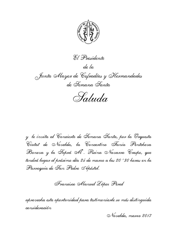 Desde la Junta Mayor de Cofradías y Hermandades de Semana Santa de Novelda, nos han hecho llegar los Saludas del Concierto de Semana Santa que se celebrará el próximo 25 de marzo a las 20:30 en la Parroquia de San Pedro Apóstol así como de la Inauguración de la Exposición de «Imágenes, Tronos y Enseres de la Semana Santa de Novelda» que se celebrará el día 27 de marzo a las 20:30 en el antiguo almacél del «Bola» c/ Padre Manjón, 4