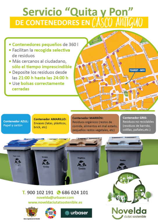 30 nov. Novelda pone en marcha un sistema de pequeños contenedores de reciclaje de “quita y pon” en varias de las estrechas calles del casco antiguo para evitar el uso de espacio público y evitar molestias a la ciudadanía. Los depósitos de selectiva se instalarán cada tarde y serán recogidos antes de las siete de la mañana.