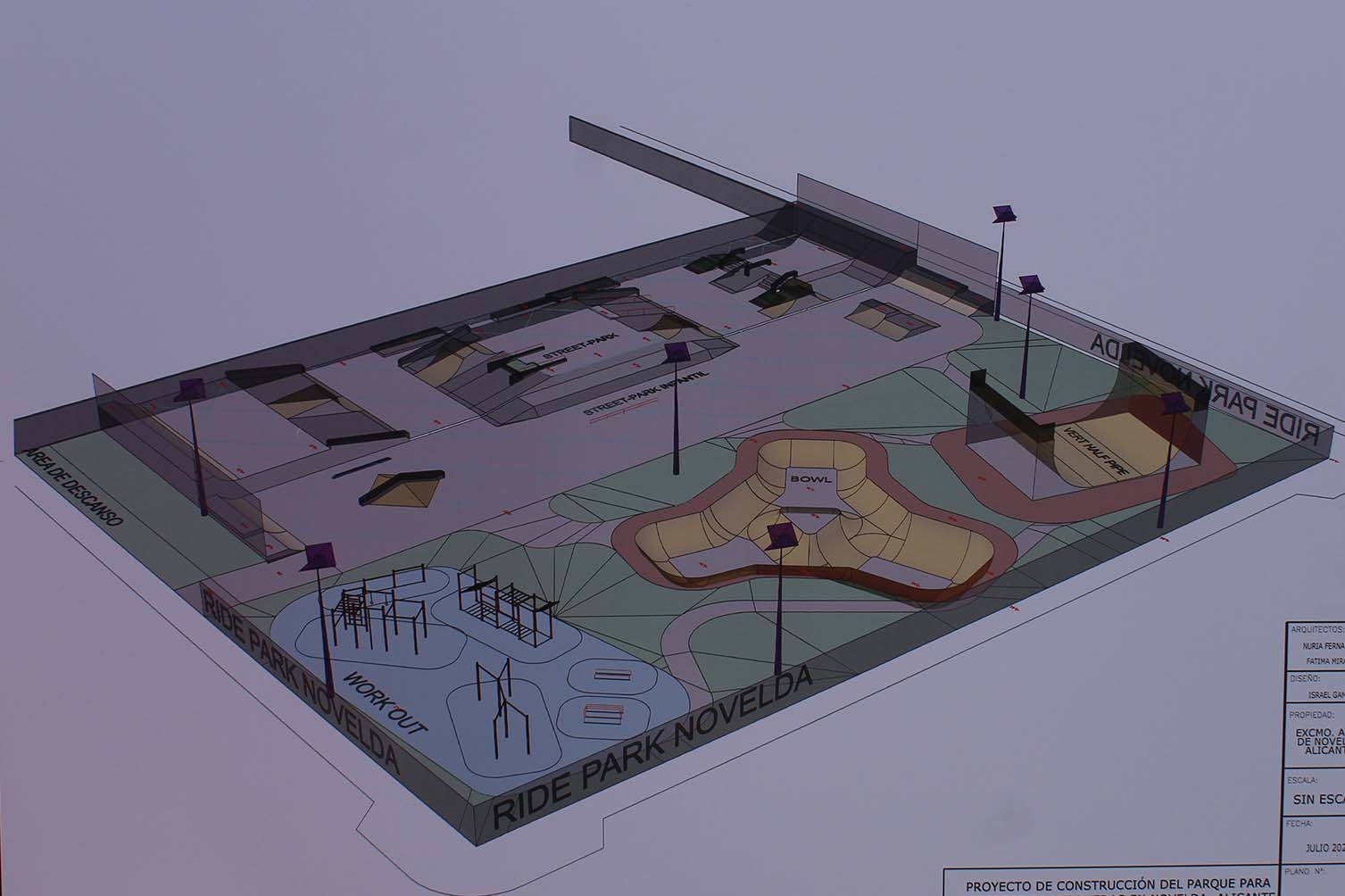 El proyecto Ride Park Novelda, que contará con un Streetpark de 1.820m2, con zonas diferenciadas para usuarios expertos y practicantes noveles, albergará zonas para la práctica del monopatín, patines, bicicleta BMX, patinete y streetboard. El proyecto se completará con una bañera o Bowl, construida en hormigón pulido, una rampa Half Pipe de cuatro metros, única en España, en la que se podrá practicar modalidades federadas, y un área completa de Street Workout para la práctica de la calistenia.