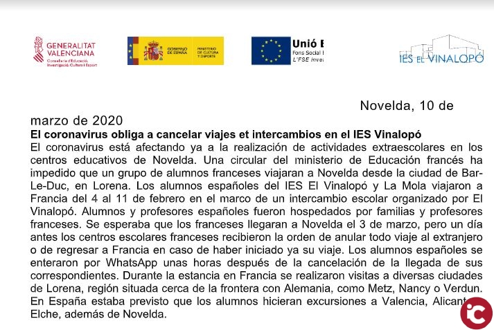 El coronavirus está afectando ya a la realización de actividades extraescolares en los centros educativos de Novelda. Una circular del ministerio de Educación francés ha impedido que un grupo de alumnos franceses viajaran a Novelda desde la ciudad de Bar-Le-Duc, en Lorena. Los alumnos españoles del IES El Vinalopó y La Mola viajaron a Francia del 4 al 11 de febrero en el marco de un intercambio escolar organizado por El Vinalopó. Alumnos y profesores españoles fueron hospedados por familias y profesores franceses. Se esperaba que los franceses llegaran a Novelda el 3 de marzo, pero un día antes los centros escolares franceses recibieron la orden de anular todo viaje al extranjero o de regresar a Francia en caso de haber iniciado ya su viaje. Los alumnos españoles se enteraron por WhatsApp unas horas después de la cancelación de la llegada de sus correspondientes. Durante la estancia en Francia se realizaron visitas a diversas ciudades de Lorena, región situada cerca de la frontera con Alemania, como Metz, Nancy o Verdun. En España estaba previsto que los alumnos hicieran excursiones a Valencia, Alicante y Elche, además de Novelda.