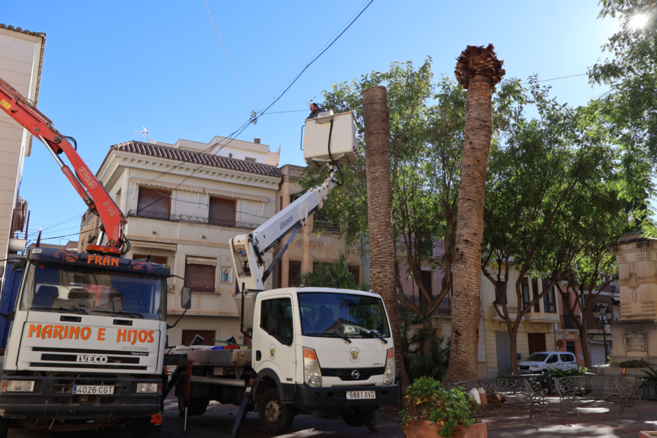12 feb. Las brigadas de mantenimiento de parques y jardines han retirado las palmeras canarias de la Plaça Vella afectadas por el picudo rojo, una operación compleja, por el gran tamaño de los ejemplares, que ha precisado del apoyo del camión grúa para su traslado al vertedero autorizado.