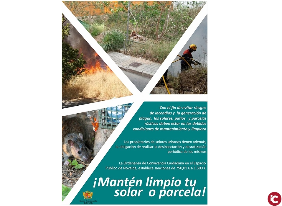 Tras la puesta en marcha de la campaña informativa para la limpieza y adecuación de solares, patios interiores y parcelas rústicas, reforzada con la promulgación de un Bando de Alcaldía, realizada desde la concejalía de Medio Ambiente, su delegada, Lourdes Abad, recordaba la obligación de los propietarios de mantener estos espacios en condiciones óptimas para evitar incendios y situaciones de insalubridad, en cumplimiento de la Ordenanza Municipal de Convivencia en el Espacio Público de Novelda, en el que se especifica incluso la exigencia de desratización y desinfección de estas propiedades. El incumplimiento de esta obligación concede al Ayuntamiento la posibilidad de incoar el correspondiente expediente sancionador, con cuantías de entre 750 a 1.500 euros.