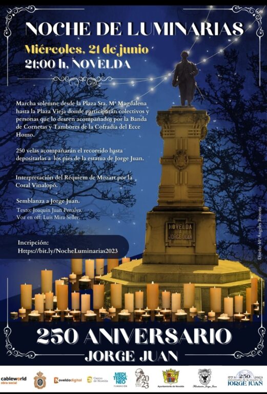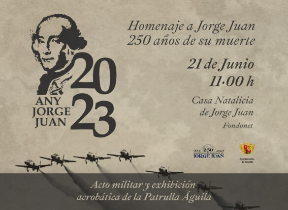 La conmemoración del 250 aniversario de la muerte de Jorge Juan y Santacilia alcanzará su máximo exponente el próximo miércoles, 21 de junio, en la finca del Fondonet que lo vio nacer el 5 de enero de 1713. A las once de la mañana está previsto que se inicie el acto militar, protagonizado por una compañía de la Comandancia Naval de Cartagena, que rendirá homenaje al conocido como Sabio Español, en un evento con desfile de tropa e izado de bandera, en el que se descubrirá un busto del insigne marino. El acto contará también con la participación de la Patrulla Águila que realizará un vuelo rasante sobre la finca y acabará con una exhibición acrobática por parte de los siete aviones que componen el escuadrón más famoso de la Academia General del Aire, con base en San Javier.