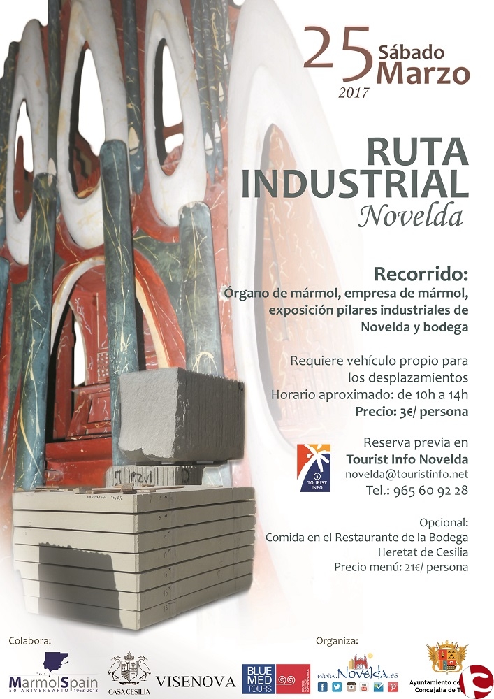 La Concejalía de Turismo organiza para el sábado 25 de marzo una ruta industrial donde se hará un recorrido por el órgano de piedra del Santuario de santa María Magdalena, la empresa de mármol Visemar, la exposición de los pilares industriales de Novelda de Marmolspain y la bodega Heretat de Cesilia. Habrá opción a quedarse a comer en la bodega tras la visita por un precio de 21 euros el menú.