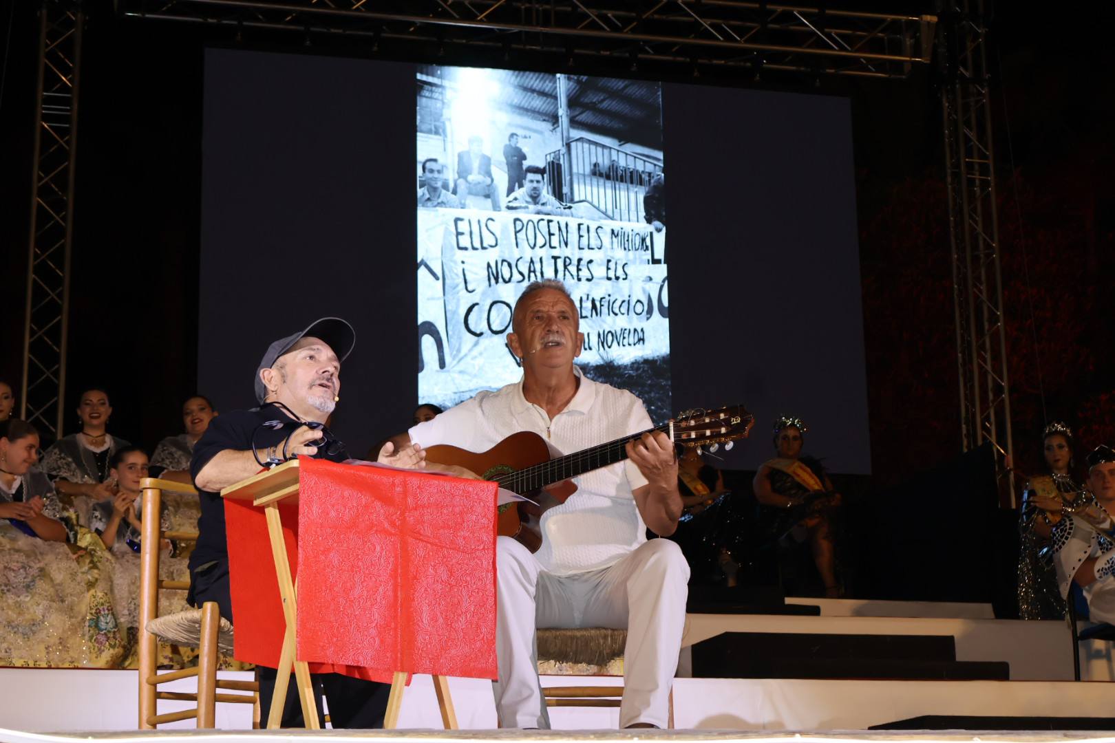 Conducida por Miriam Pérez Boyer la gala recibió con su mítico quad al pregonero, Ramiro Verdú Doménech, el conocido fotógrafo noveldense que ofreció un divertido pregón, repleto de anécdotas, historias y entrañables vivencias, en el que no faltó la música, con la interpretación de una de las tradicionales “canciones de mona” novelderas acompañado por la voz y guitarra Antonio Serrano.