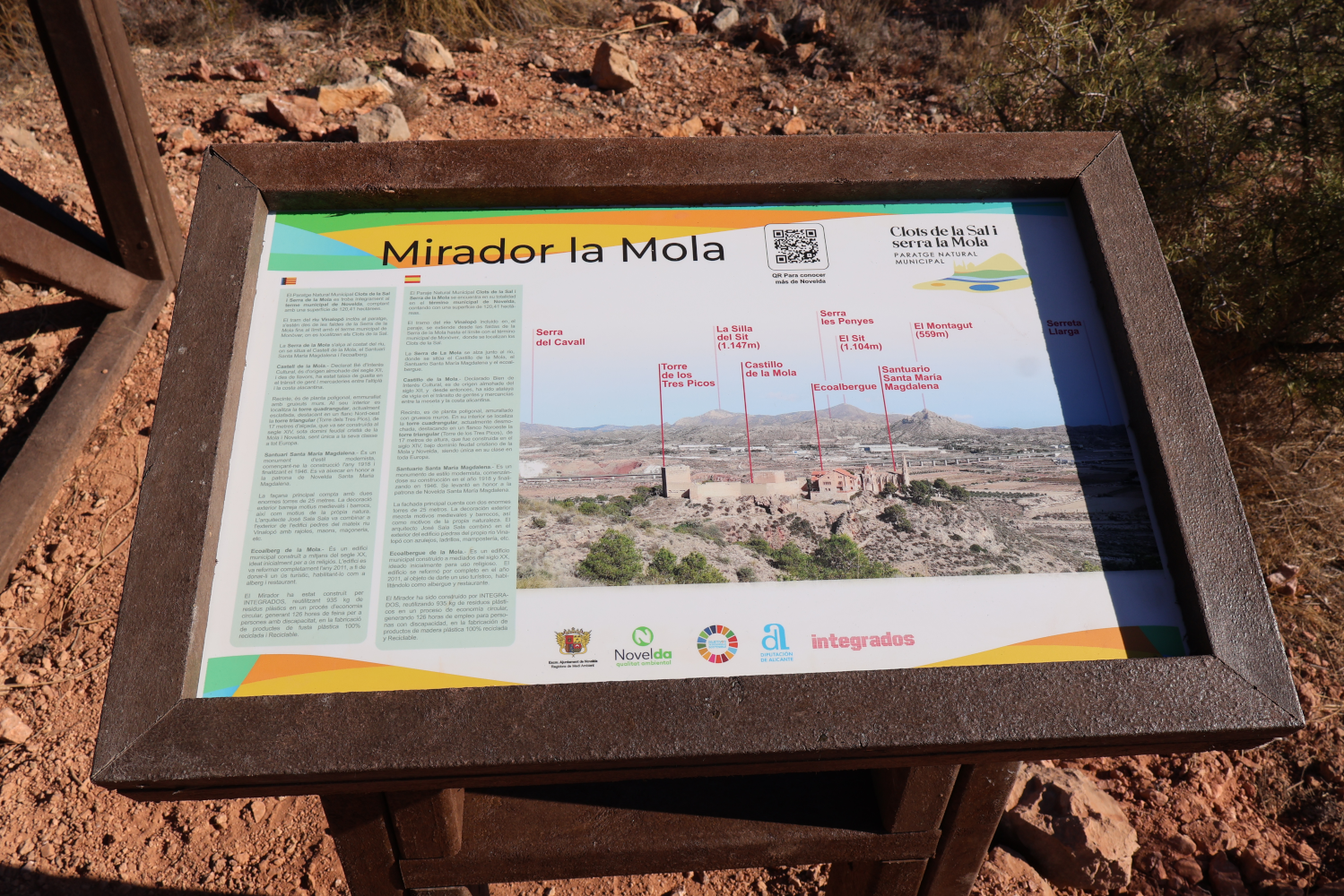 Este nuevo mirador en el Paraje Natural Municipal dels Clots de la Sal i Serra de La Mola permite, a través del atril informativo, conocer los datos más significativos del paraje, del Santuario de Santa María Magdalena, Castillo de La Mola y el Ecoalbergue y, a su vez, presenta una amplia información geográfica de las principales sierras y cumbres que se observan desde el mismo.