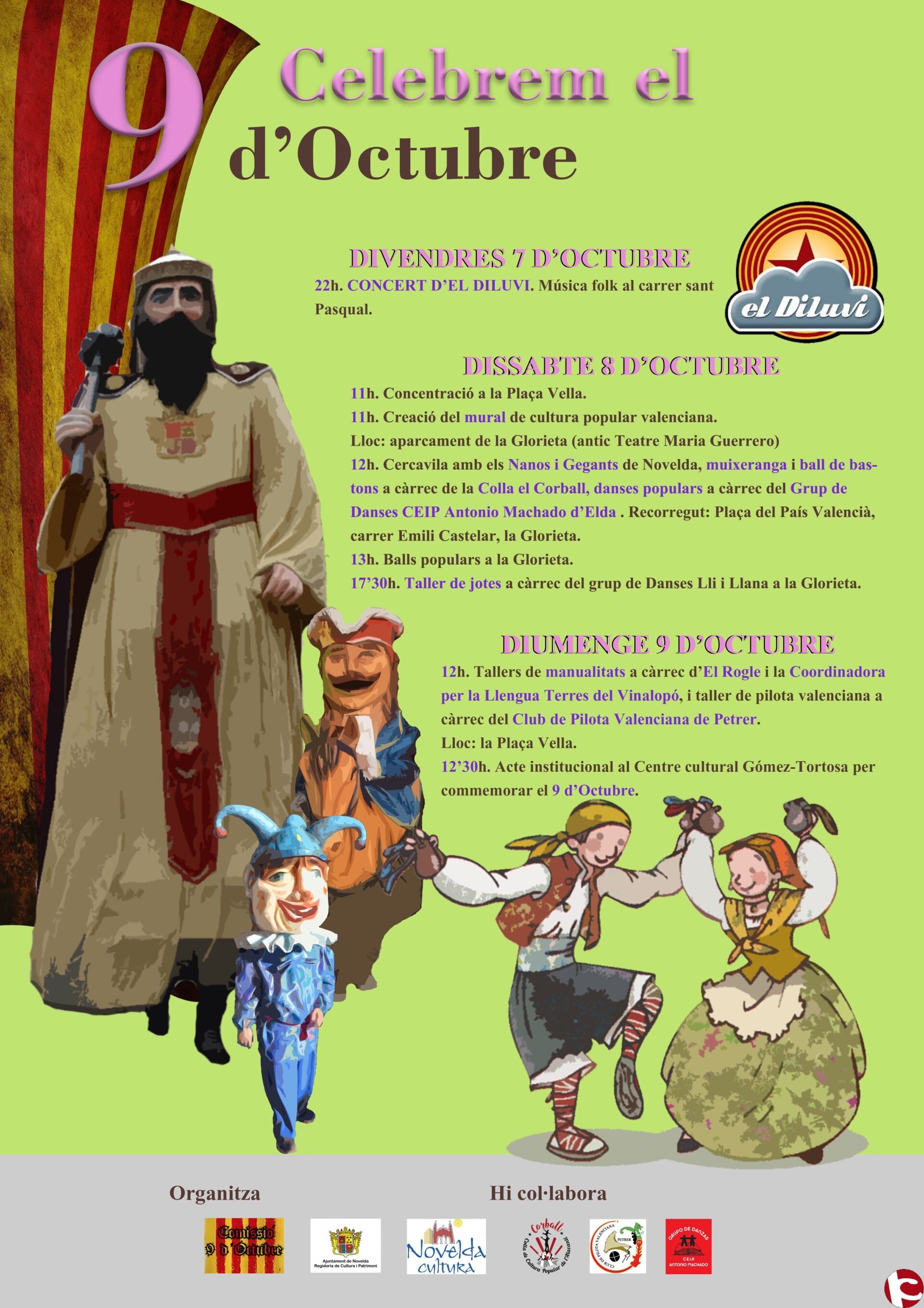 La creación de un mural de cultura popular valenciana, un pasacalles a cargo de la Colla de Nanos y Gegants de Novelda, talleres y bailes populares centrarán la jornada del sábado mientras que el domingo, 9 de octubre, la Plaça Vella acogerá, desde las doce de la mañana, talleres de manualidades y pelota valenciana. Un programa con el que se pretende, según Sáez, dar mayor realce a la fiesta y reconocer el origen de nuestro sentido como Comunitat Valenciana.