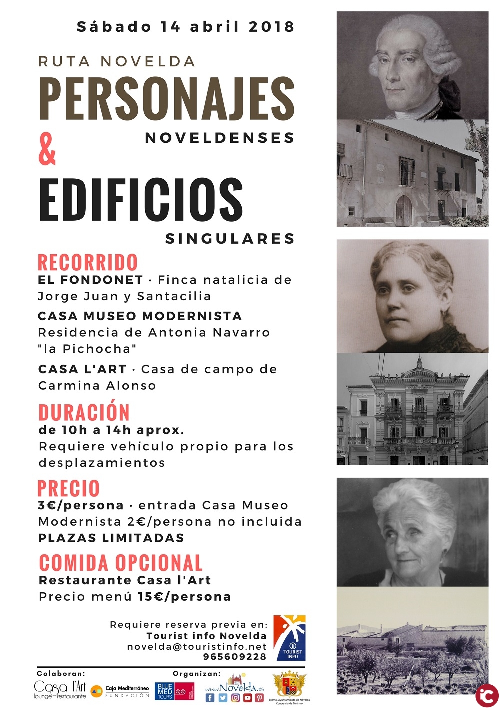 La Concejalía de Turismo organiza para el sábado 14 de abril una novedosa ruta en la que se realiza un recorrido por tres personajes y edificios singulares de Novelda: Jorge Juan y Santacilia, Antonia Navarro «La Pixoxa» y Carmina Alonso.