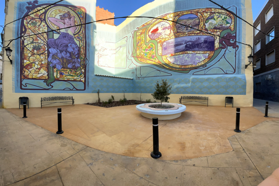 Este pequeño rincón se ha transformado en zona de descanso al amparo de dos espectaculares murales que, realizados por el equipo de artistas de DobleTrece, han conseguido reproducir en su imagen el espíritu del arte modernista que impregna buena parte de los inmuebles y fachadas del centro histórico de la ciudad.
