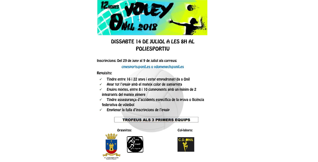 El proper dissabte 14 de juliol a les 8h es celebrarà a Onil les 12 Hores de Vòlei al Poliesportiu d’Onil.