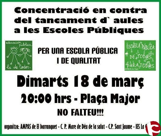 Hui a les 18 de març a les 20h, hem convocat una concentració a la Plaça Major per reivindicar que nos ens tanquen l´unitat educativa de 3 anys….s´ha de fer molt soroll, que se´ns escolte…vos esperem a tots!! Volem una educació pública i de qualitat.