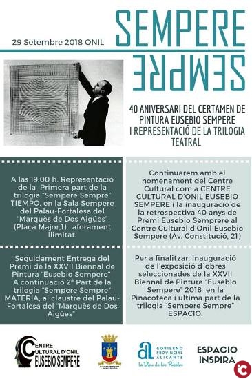 Seguidamente, los asistentes se dirigieron al Centro Cultural de Onil, donde se descubrió la rotulación de la nomenclatura del edificio como Centro Cultural de Onil Eusebio Sempere. En el interior, se ofreció a los asistentes un vino de honor, y se hizo un reconocimiento a todos los Concejales de Cultura de Onil y Alcaldes que, desde aquel 1978 hasta ahora, edición tras edición, tanto se han comprometido en conservar y mejorar este Premio. A continuación se pasó a presenciar el tercer acto del espectáculo Sempere Sempre que tuvo lugar en la pinacoteca del Centro Cultural. Por último, en la misma sala, se inauguró la exposición de obras seleccionadas y del ganador de la XVII Bienal de pintura en honor a Eusebio.