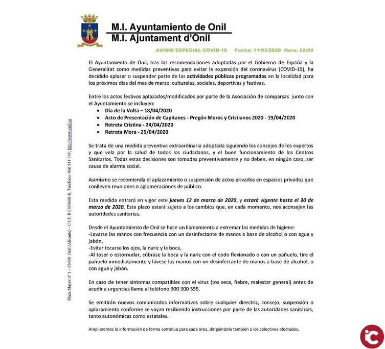 Hablamos con la primera autoridad local, Humi Guill, para informar sobre los actos inminentes festeros aplazados y suspendidos.