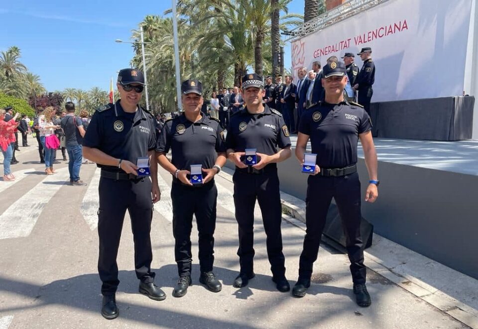 La gran actuación en distintos incidentes de los cuatro agentes de la Policía Local que han prestado sus servicios en Onil, ha sido reconocida esta mañana en Elche con la condecoración por parte de la Agencia Valenciana de Seguridad y Respuesta a las Emergencias (AVSRE) de la Generalitat Valenciana.