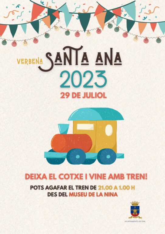Per a anar a la verbena del dissabte 29 en Santa Anna, l’Ajuntament d’Onil posarà un tren turístic des de les 21:00h fins a la 01:00h, hi haurà servei de trens eixint des del Museu de la Nina.