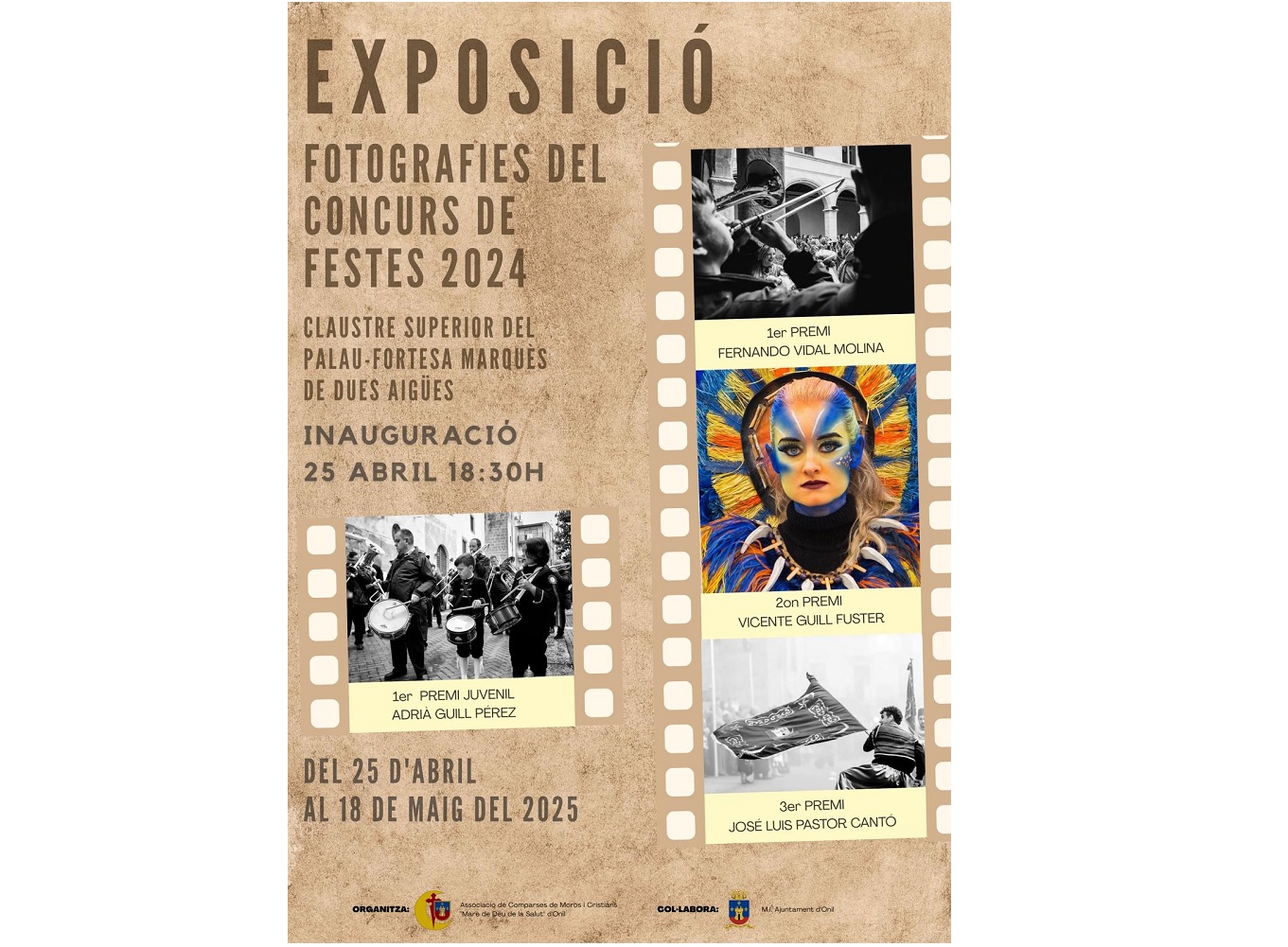 El pròxim divendres 25 d’abril de 2025, a les 18:30 hores, tindrà lloc la inauguració oficial de l’Exposició de Fotografies del Concurs de Fotografia Festes de Moros i Cristians d’Onil 2024. L’acte se celebrarà al claustre superior del Palau-Fortalesa del Marquès de Dos Aigües, ubicat a la Plaça Major número 1 d’Onil.