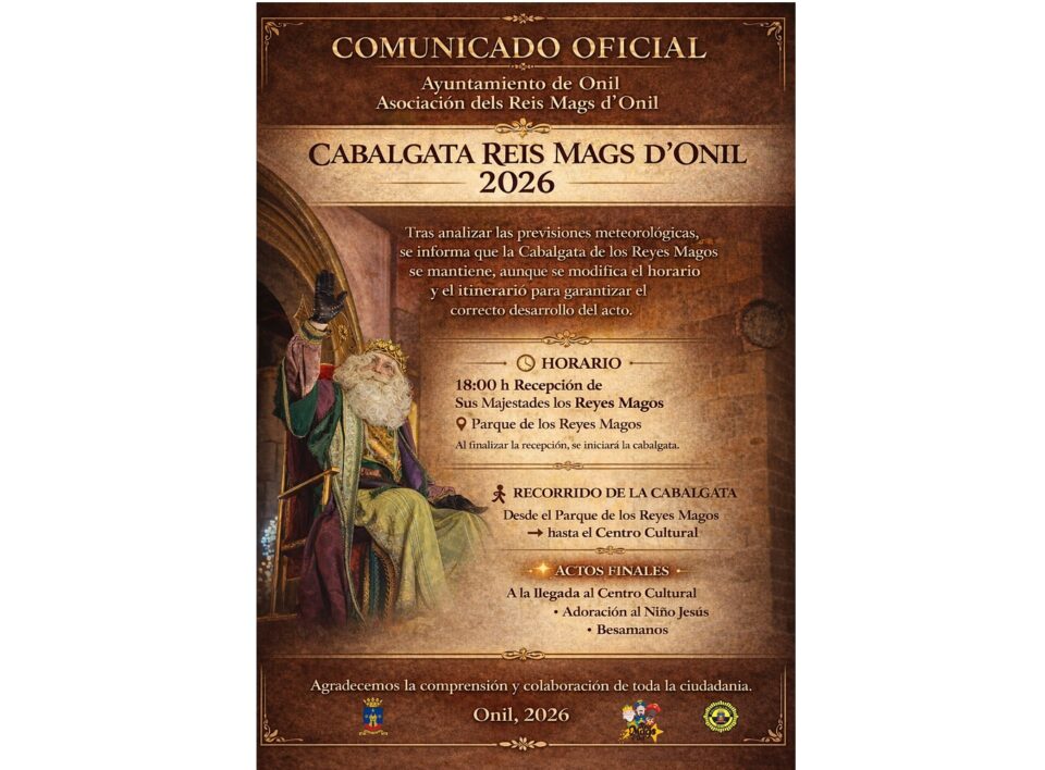 El Ayuntamiento de Onil y la Asociación dels Reis Mags d’Onil informan que, tras analizar las previsiones meteorológicas previstas para el día de la Cabalgata de Reyes Magos, el acto se mantiene, aunque se ha decidido modificar el horario y el itinerario con el objetivo de garantizar la seguridad y el correcto desarrollo de todos los actos programados.
