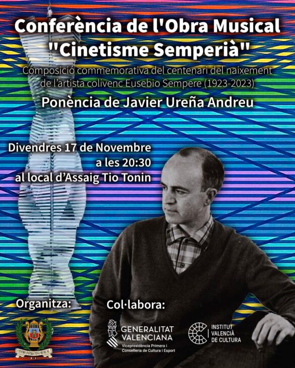 A més, el divendres 17 de novembre, tindrà lloc una interessant conferència sobre l’obra musical «Cinetisme Semperià» al local d’assaig «Tio Tonin». Ponència a càrrec de Javier Ureña, compositor colivenc d’aquesta obra musical commemorativa del centenari del naixement de l’artista colivenc internacional Eusebio Sempere (1923-2023).