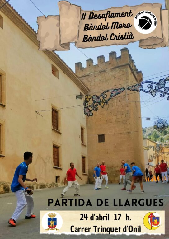 Amb motiu de les Festes de Moros i Cristians d’Onil, va a celebrar-se el II Desafiament del Bàndol Moro contra el Bàndol Cristià, al carrer Trinquet (C/ Vicente Navarro) d’Onil, el 24 d’abril, a les 17:00 hores. Partida de Pilota Valenciana modalitat de «llargues«. Els adjuntem el cartell anunciador, on poden obtindre més informació.