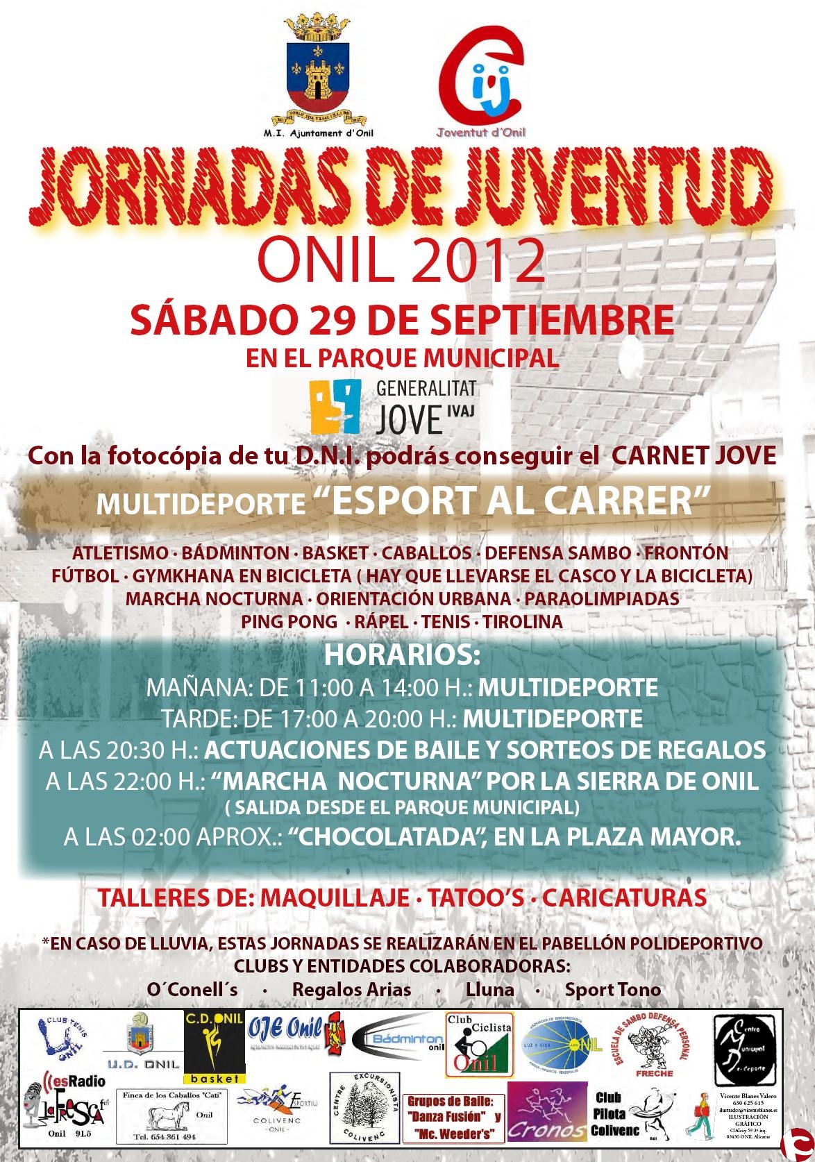 Mediante el presente les adjuntamos Cartel JORNADAS DE JUVENTUD DE ONIL 2012, que tendrán lugar el sábado 29 de septiembre, en el Parque Municipal de Onil.