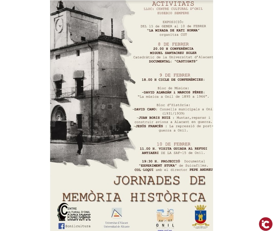 Des de la Regidoria de Cultura de lAjuntament dOnil, comptant amb el suport de la Universitat dAlacant, sha impulsat lorganització dunes Jornades de memòria històrica. Lobjectiu destes Jornades és difondre i aprofundir sobre la història d’Onil, pobles propers, i per extensió, de tot el territori valencià. El que es pretén, és fer participar a Onil i pobles del voltant de la seua història, democratitzar-la i fer partícips, especialment als joves, desta història que és la seua.