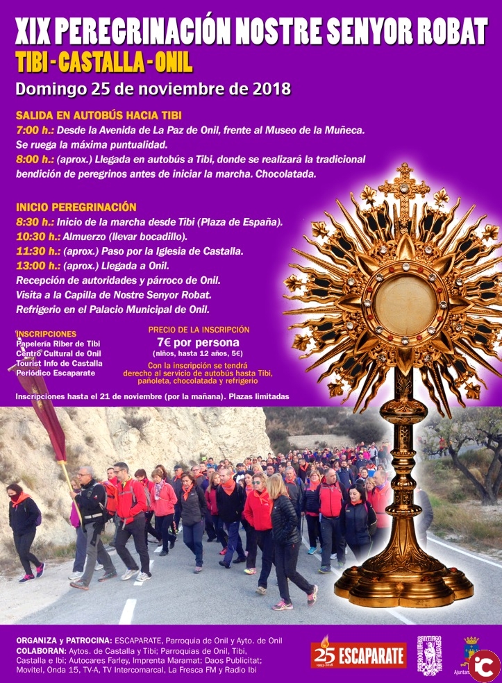 Un año más, el periódico Escaparate promueve, junto con la Parroquia y el Ayuntamiento de Onil, la Peregrinación de Nostre Senyor Robat, una romería que cumple su decimonovena edición y rememora la peregrinación que tuvo lugar en 1824 entre Tibi y Onil, después de que una vecina de Tibi encontrara en el paraje de la Pedrera un viril de oro con la sagrada forma consagrada en su interior, que había sido robada recientemente en Onil por parte de un antiguo monaguillo.