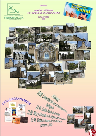 Desde la Asociación de Afectados/as Fibromialgia de “La Foia de Castalla”, les invitan a participar en la Marcha y Ofrenda a la Virgen de la Salud de Onil, el domingo día 6 de Abril de 2014 a las 10:00 Horas. Salida desde el Polideportivo de Onil.