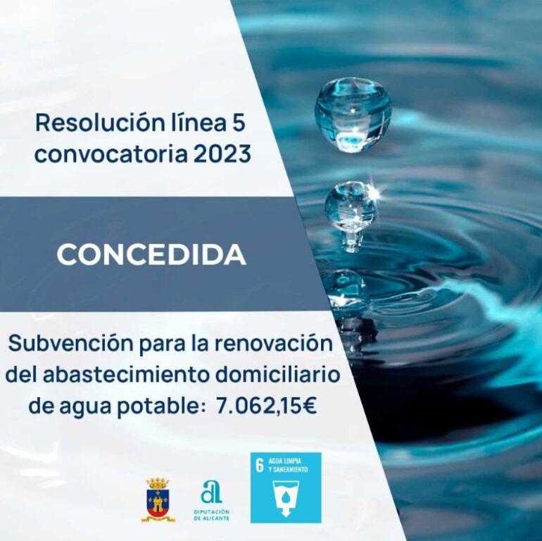 L’Ajuntament ha rebut una subvenció de 7.062,15 € de la Diputació d’Alacant per a la renovació del sistema de proveïment domiciliari d’aigua potable.