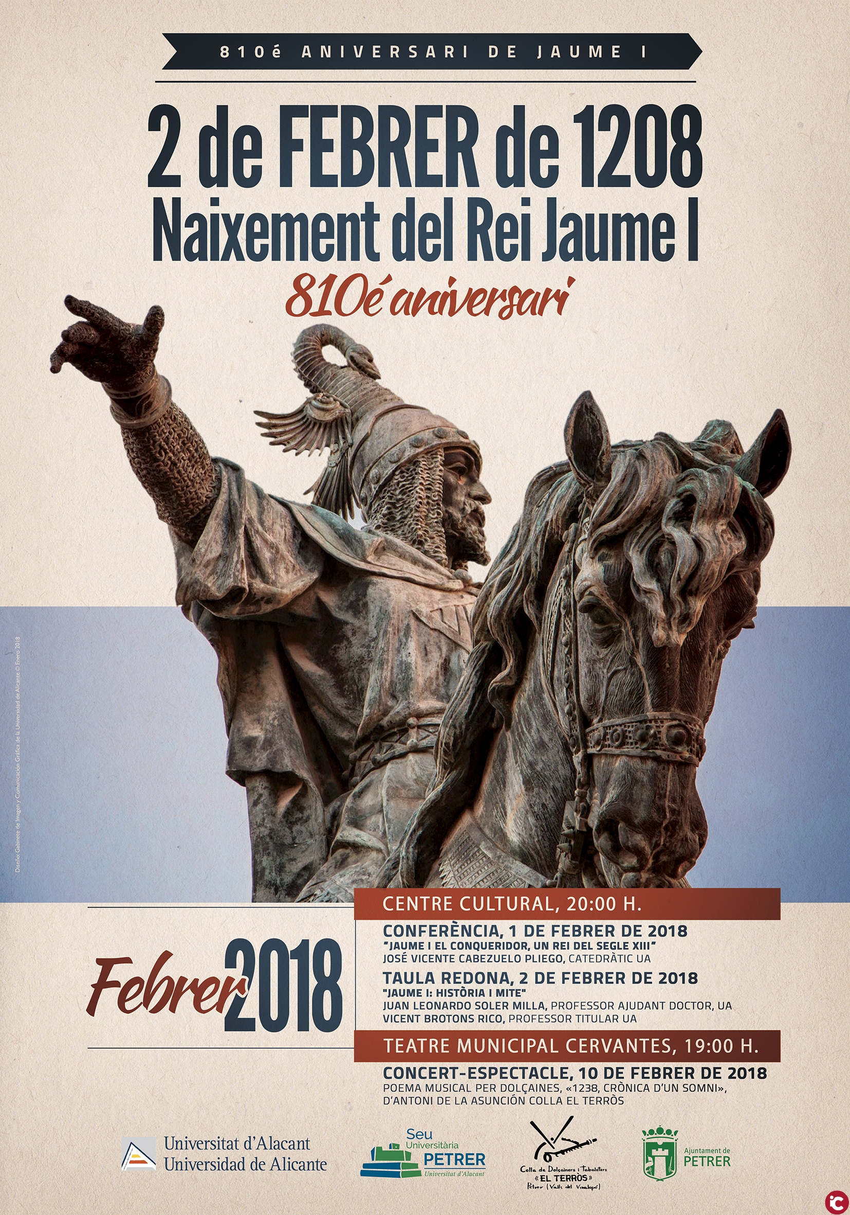 La Colla de Dolçainers i Tabaleters El Terròs de Petrer junto con el coro de voces de la Escuela de Múisica Tradicional y danza de Petrer, después del éxito obtenido tras la representación del concierto de 1238 Crònica un Somni en Octubre de 2017 y debido a la demanda suscitada por mucha de gente de Petrer, estos dos colectivos han decidido reponer este espectáculo de nuevo aprovechando el ciclo del 810 Aniversario del nacimiento de Jaume I El Conquistador que se va a realizar en Petrer los dias 1, 2 y 10 de Febrero y que ha organizado en colaboración con la sede universitaria de Alicante en Petrer y que cuenta con la colaboración del Excmo. Ayuntamiento de Petrer y la Obra Social de Caixapetrer