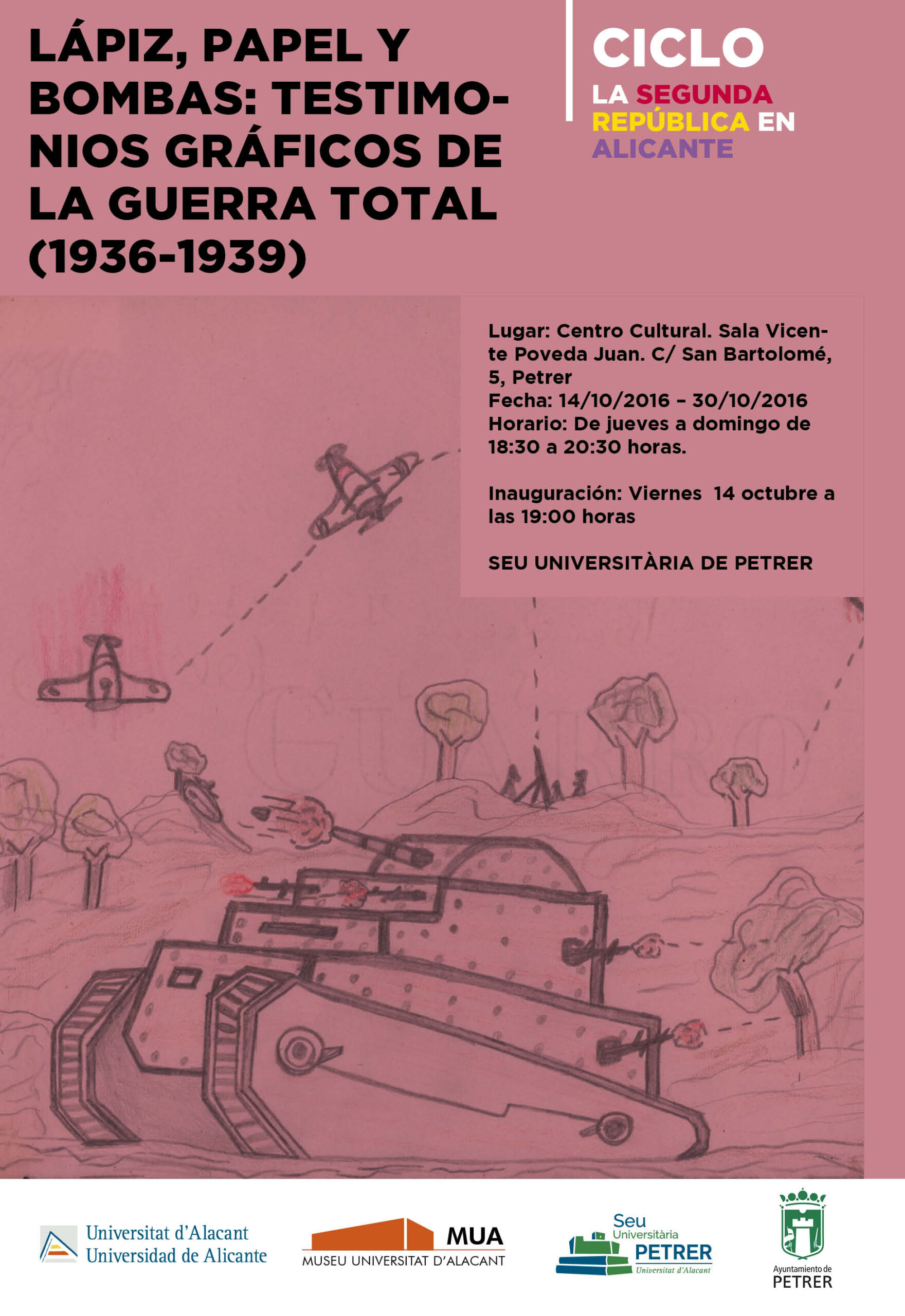 Dos exposiciones serán las protagonistas de los meses de octubre y noviembre: Tiempo II: Lápiz, papel y bombas, testimonios gráficos de la guerra total (1936-1939), del 14 al 30 de octubre, en la Sala Vicente Poveda Juan. Centro Cultural. C/ San Bartolomé, 5. Petrer, y, Tiempo III: El final de la guerra. Represión y exilio, del 11 al 27 de noviembre, en el Horno Cultural. Plaza Francisco López Pina, s/n. Petrer. Se trata de una muestra compuesta por 18 paneles explicativos además de diverso material impreso que ha tratado de recoger cómo se desarrolló este proceso en la provincia de Alicante, con imágenes y documentos procedentes de numerosas localidades para conocer mejor esta etapa del siglo XX.