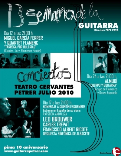 El teatro municipal Cervantes acogió en la noche de ayer sábado el concierto de clausura de la XIII semana de la Guitarra «Villa de Petrer». El balance realizado tanto por Pepe Payá, organizador del evento junto con la asociación PIMA, como por José Miguel Payá, concejal de Cultura, ha sido muy positivo ya que, a pesar de las dificultades económicas a las que se enfrentaba este festival, se ha conseguido completar uno de los mejores carteles de cuantos eventos similares se celebran. Los conciertos se han desarrollado en diversos escenarios, tanto auditorios cerrados como al aire libre. Lugares como el Teatro Cervantes, el Centro Cultural, el Castillo, l Parque 9 d´Octubre o la Plaça de Baix han recogido a estos maestros de la guitarra clásica que han dejado un excelente sabor de boca tanto al público local como a las muchas personas que han venido de toda España para presenciar los magistrales conciertos.
