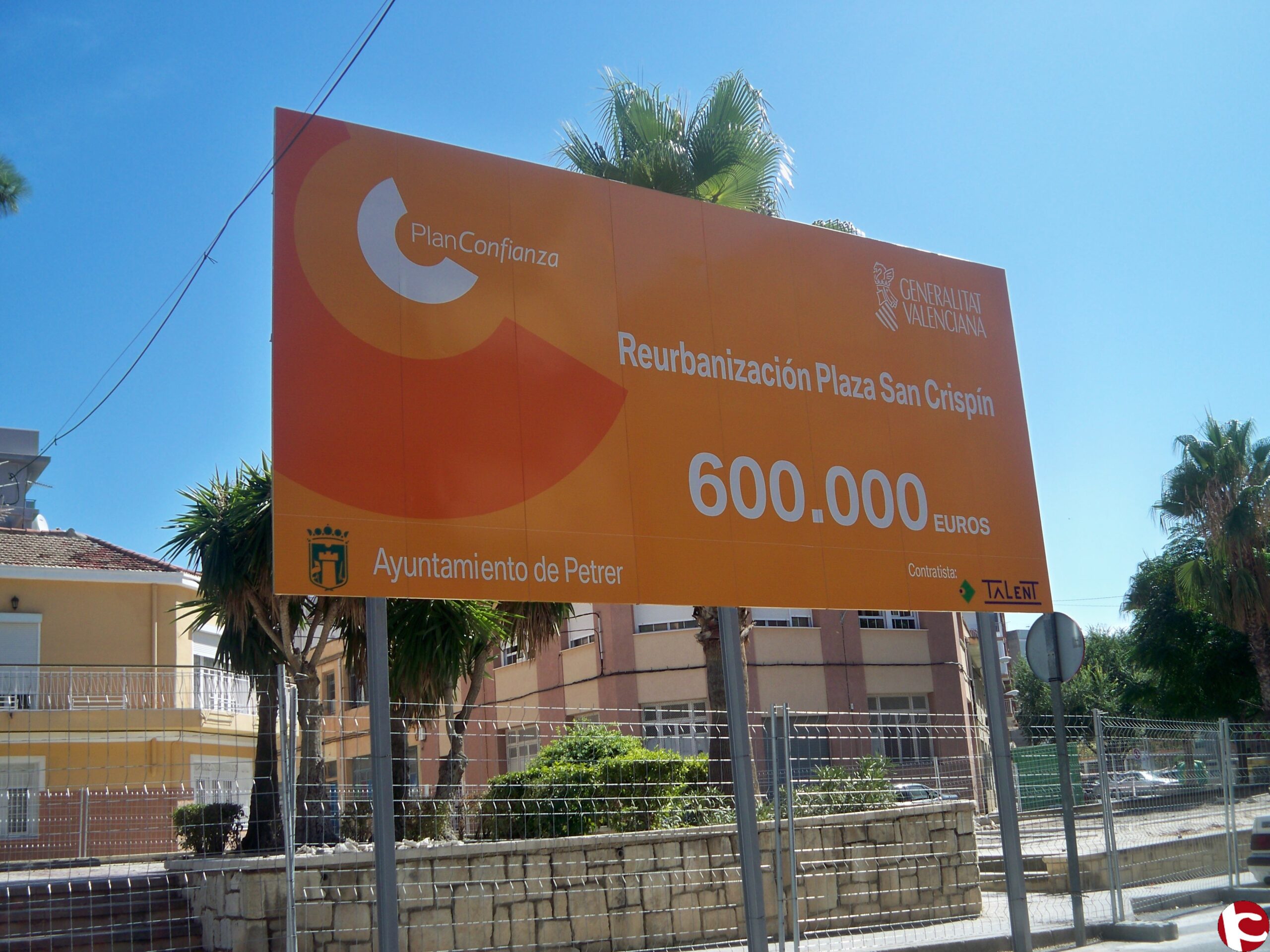 Por último, Campello también ha querido hacer referencia al tamaño, en su opinión desmesurado, de la valla publicitaria que anunciaba el proyecto, cuyo coste será de 600.000 y está financiado por el Plan Confianza de la Generalitat, indicando que «no es necesario colocar una valla que es casi mas grande que la propia plaza para anunciar la ejecución de unas obras que, por otra parte, creemos necesarias, pero no de la forma de que momento se están llevando a cabo. El PP debería preocuparse menos de hacer este tipo de acciones de propagandísticas y promocionales del Plan Confianza del Sr. Camps y mas por trabajar por la ciudadanía desde la humildad y la austeridad».
