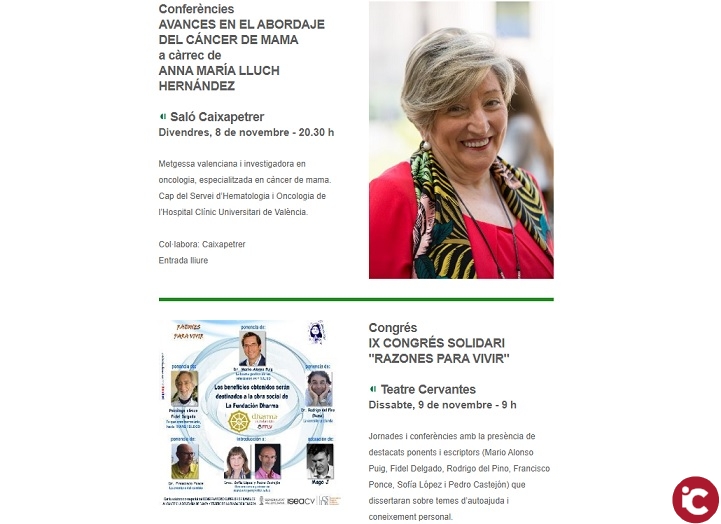 -Conferències: AVANCES EN EL ABORDAJE DEL CÁNCER DE MAMA a càrrec de Anna María Lluch, en el Saló Caixapetrer, el divendres, 8 de novembre – 20.30 h.