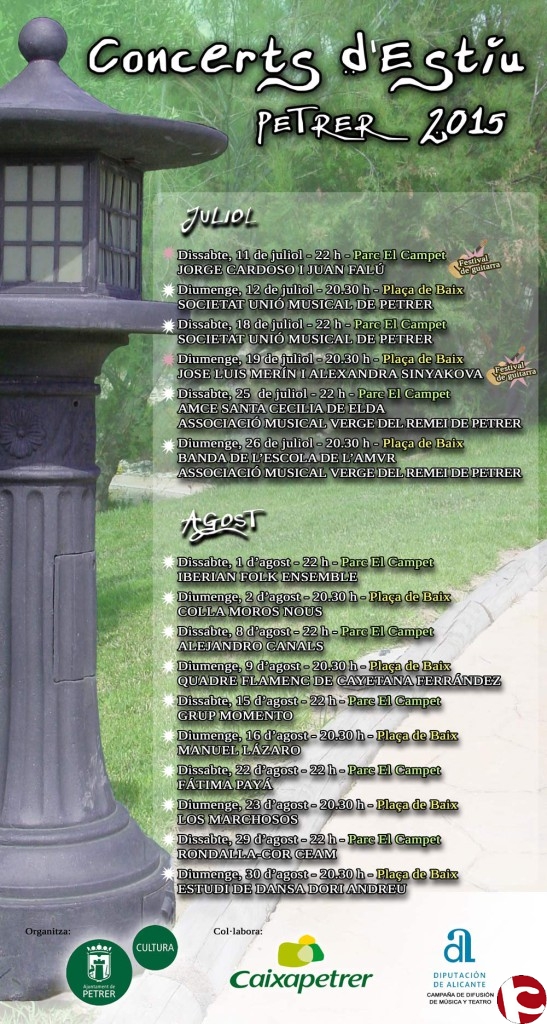 Del 11 de julio al 30 de agosto de 2015 se celebrará en Petrer una nueva edición de los tradicionales Concerts d´Estiu, un festival de música y artes escénicas que permitirá comprobar una vez más la riqueza cultural de nuestro pueblo con la actuación de sus bandas de música, coros y rondallas, grupos de danza y formaciones musicales.