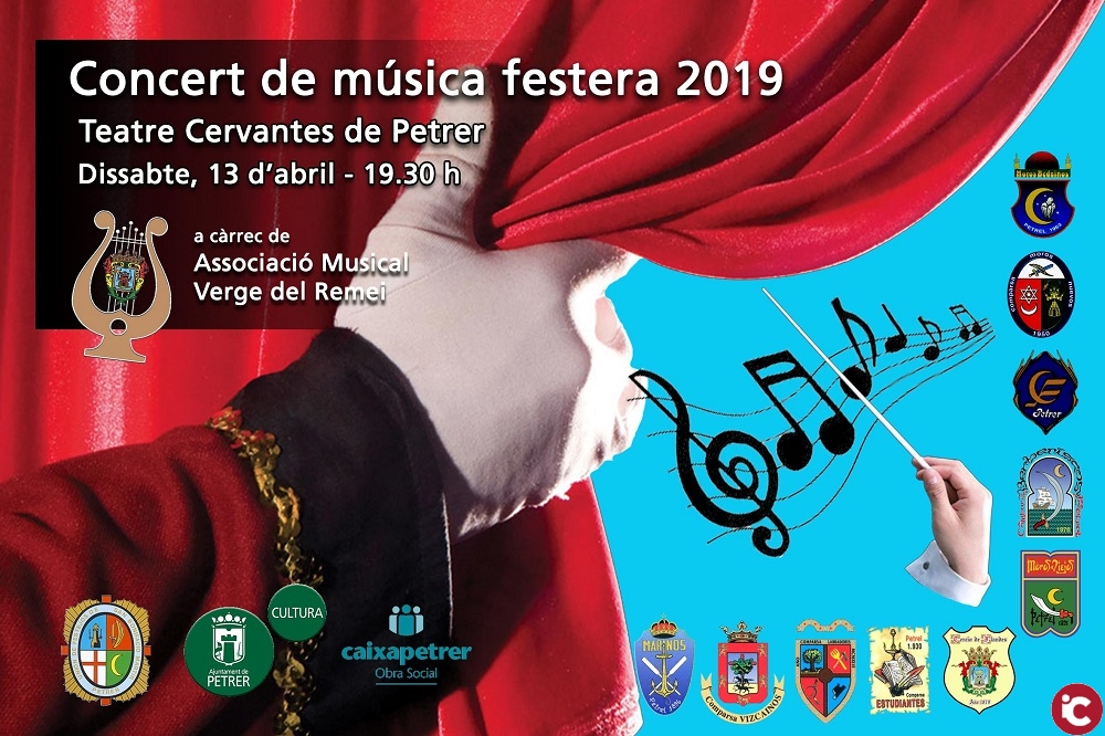 El próximo sábado 13 de Abril tendrá lugar el XXXI Concierto de Música Festera previo a nuestras Fiestas de Moros y Cristianos 2019, a partir de las 19:30 horas en el Teatro Cervantes a cargo de la Asociación Musical Virgen del Remedio de Petrer, la cual interpretará un concierto dividido en dos partes.