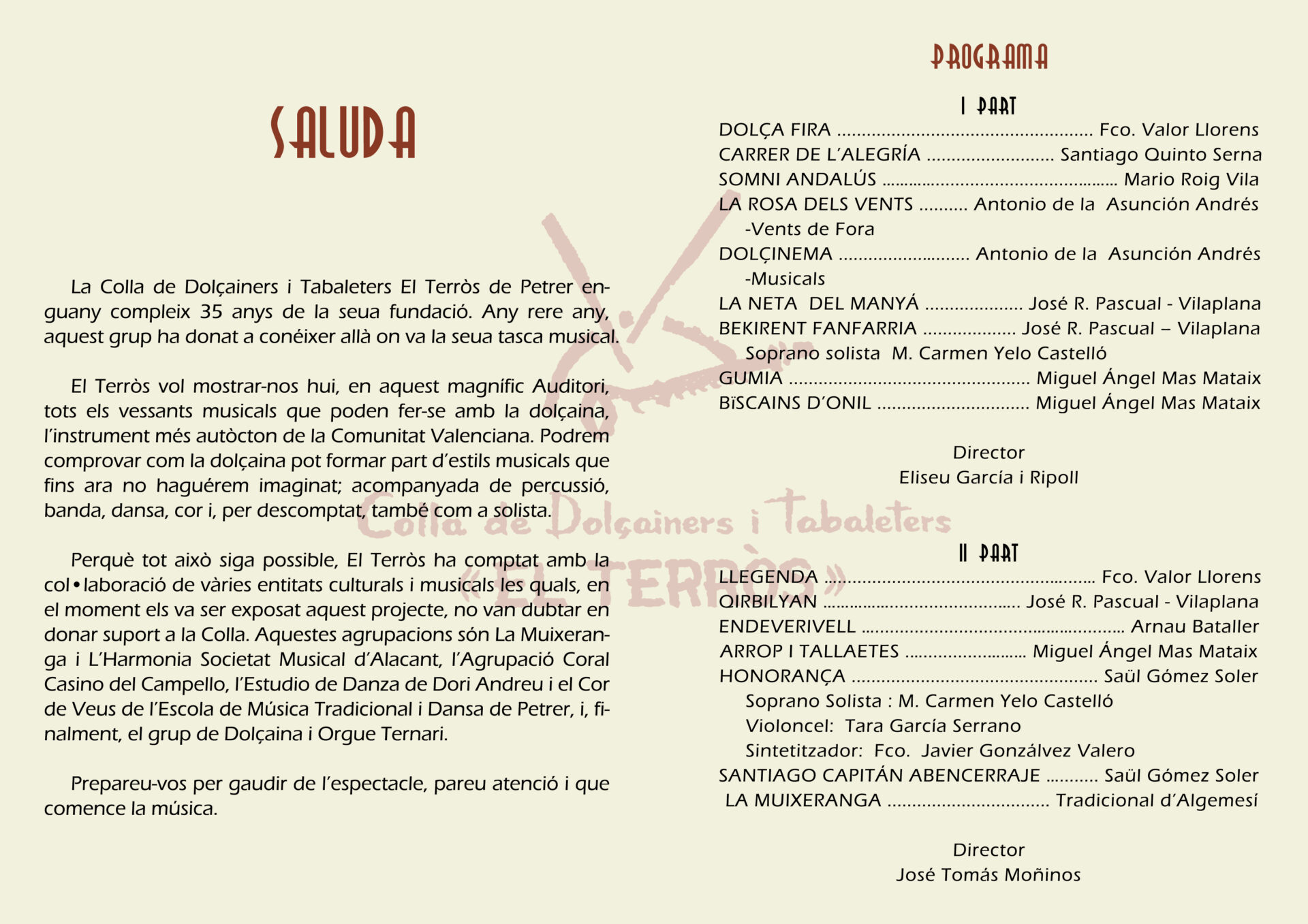 El próximo 19 de septiembre, en el ADDA, y conmemorando el 35 aniversario de la Colla de dolçainers i tabaleters El Terrós de Petrer, dirigida por el maestro Eliseu García, la banda titular de LHarmonia, dirigida por José Tomás Moñinos, colaborará en un evento extraordinario con piezas de concierto, populares y de música festera. Se adjunta el programa.