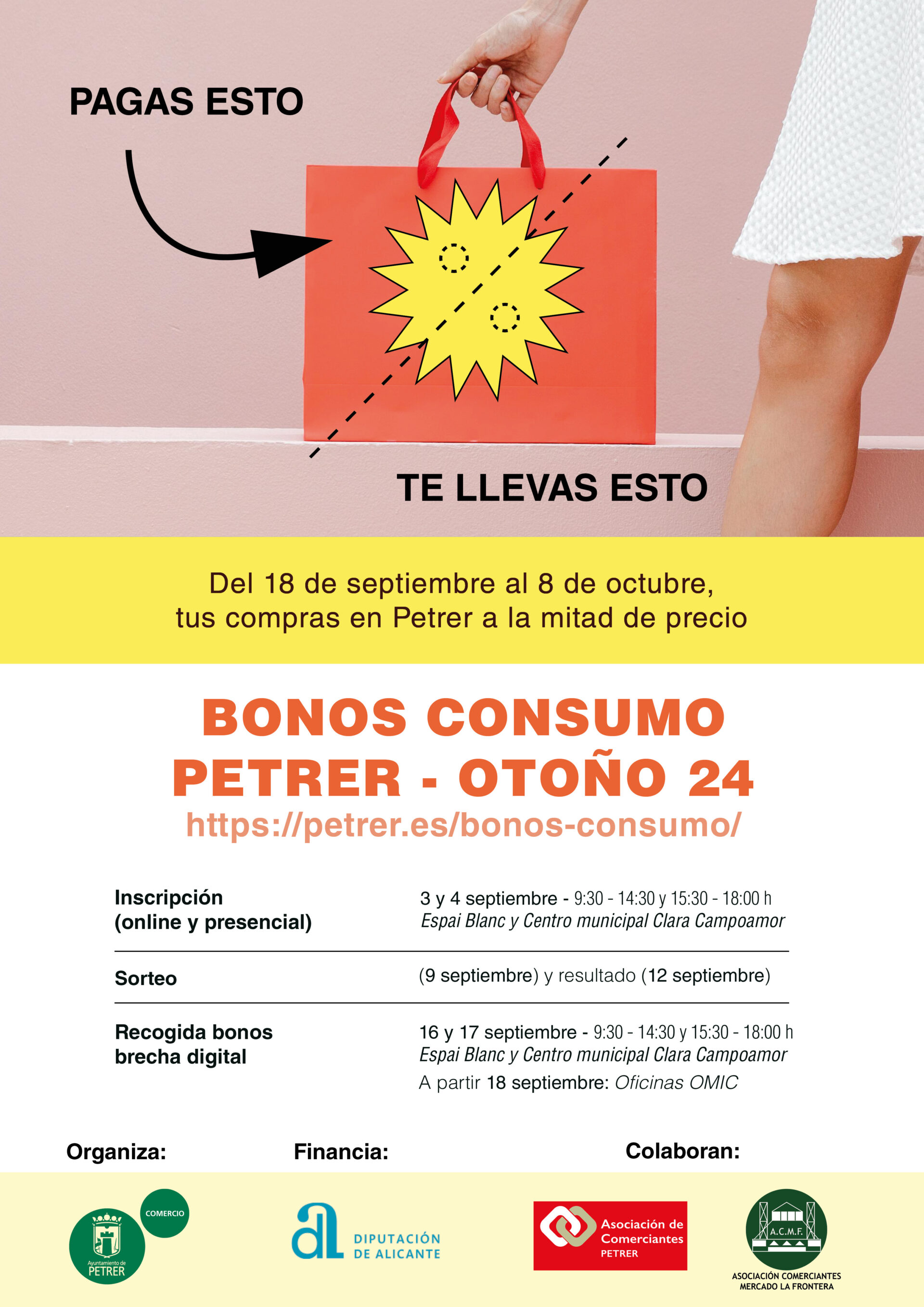 La próxima semana, la concejalía de Comercio del Ayuntamiento de Petrer activará una nueva campaña de Bonos Consumo, “Bonos Consumo Otoño 2024”, abriendo la inscripción para participar en la campaña los días 3 y 4 septiembre, tanto de manera online a través de la web https://petrer.es/bonos-consumo/, desde las 09:00 horas del 3 de septiembre hasta las 23:59 del 4 de septiembre; como, para aquellas personas de la llamada brecha digital, de manera presencial en los espacios municipales Clara Campoamor y Espai Blanc, en horario de 9:30 a 14:30 y de 15:30 a 18:00 horas.