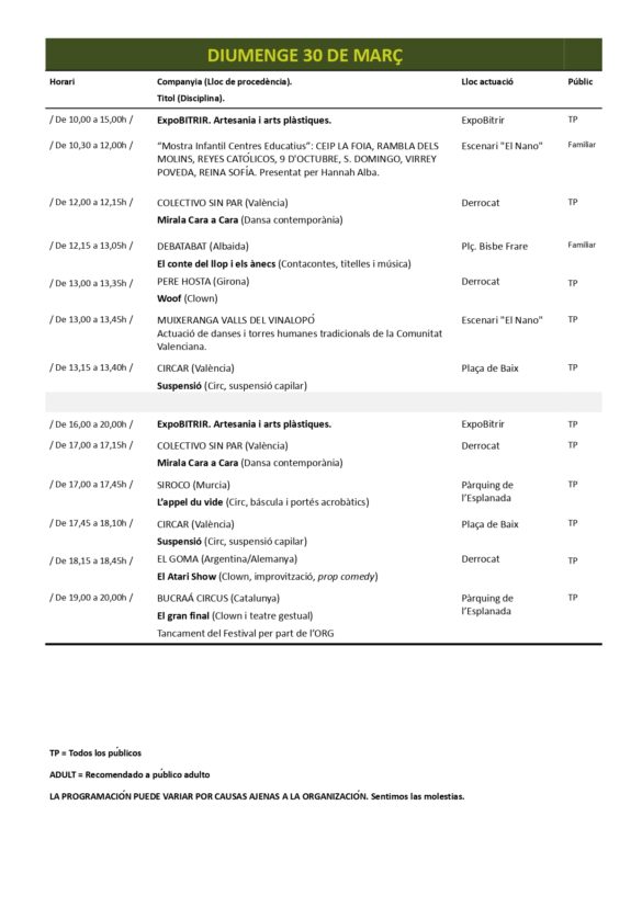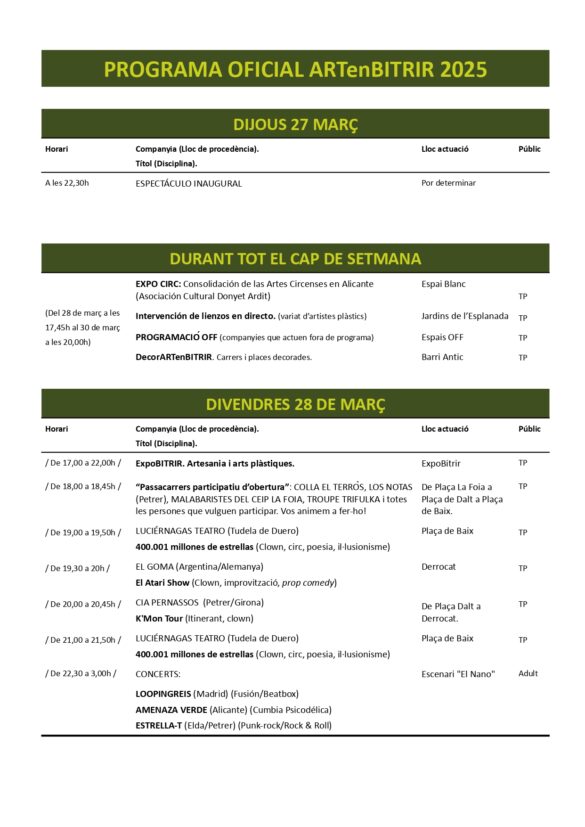 Las festividades comenzaron el jueves 27 de marzo con «The Atari Show» de El Goma, un espectáculo de clown y comedia física que deleitó al público en el Ateneu Cultural Republicano. El viernes 28, las calles se llenaron de vida con actuaciones de compañías nacionales e internacionales de teatro, circo, danza y música. Por la noche, el escenario «El Nano» acogió conciertos de Loopingreis, Amenaza Verde y Estrella-T.