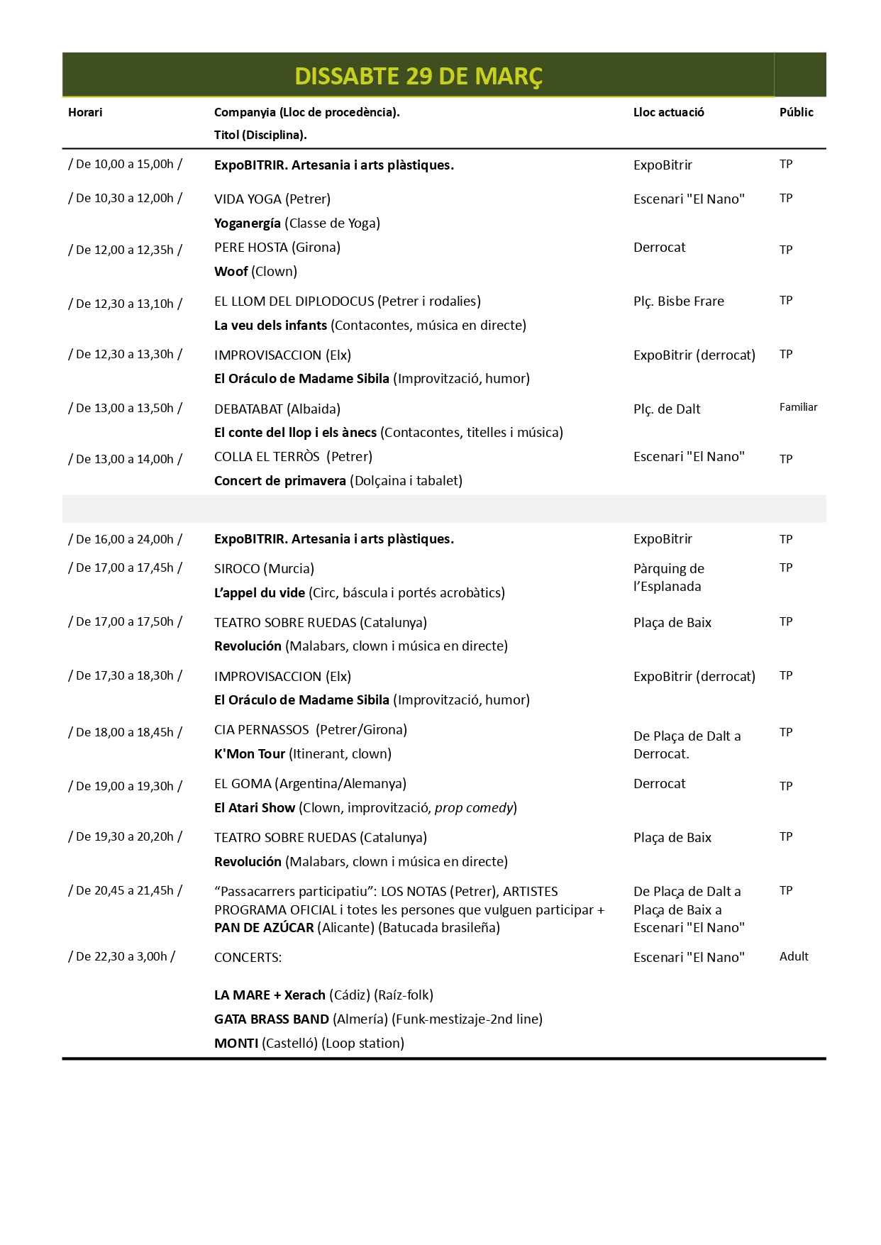 Hoy, sábado 29 de marzo, las actividades continúan con una variada programación artística en seis espacios del casco antiguo, incluyendo la plaça de Baix y la plaça de Dalt. Esta noche, el escenario «El Nano» presentará a La Mare, Gata Brass Band y Monti, prometiendo una velada llena de ritmo y energía.