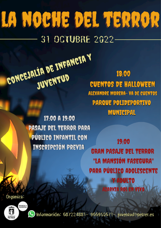 Las concejalías de Cultura y de Infancia y Juventud se dan la mano para ofrecer una Noche de Difuntos con actividades para todos los públicos el lunes 31 de octubre en Petrer, “una programación bien amplia que aborde todo el abanico de edades y que todas y todos podamos disfrutar de esta importante noche”, en palabras del concejal de Infancia y Juventud, Alejandro Ruiz.