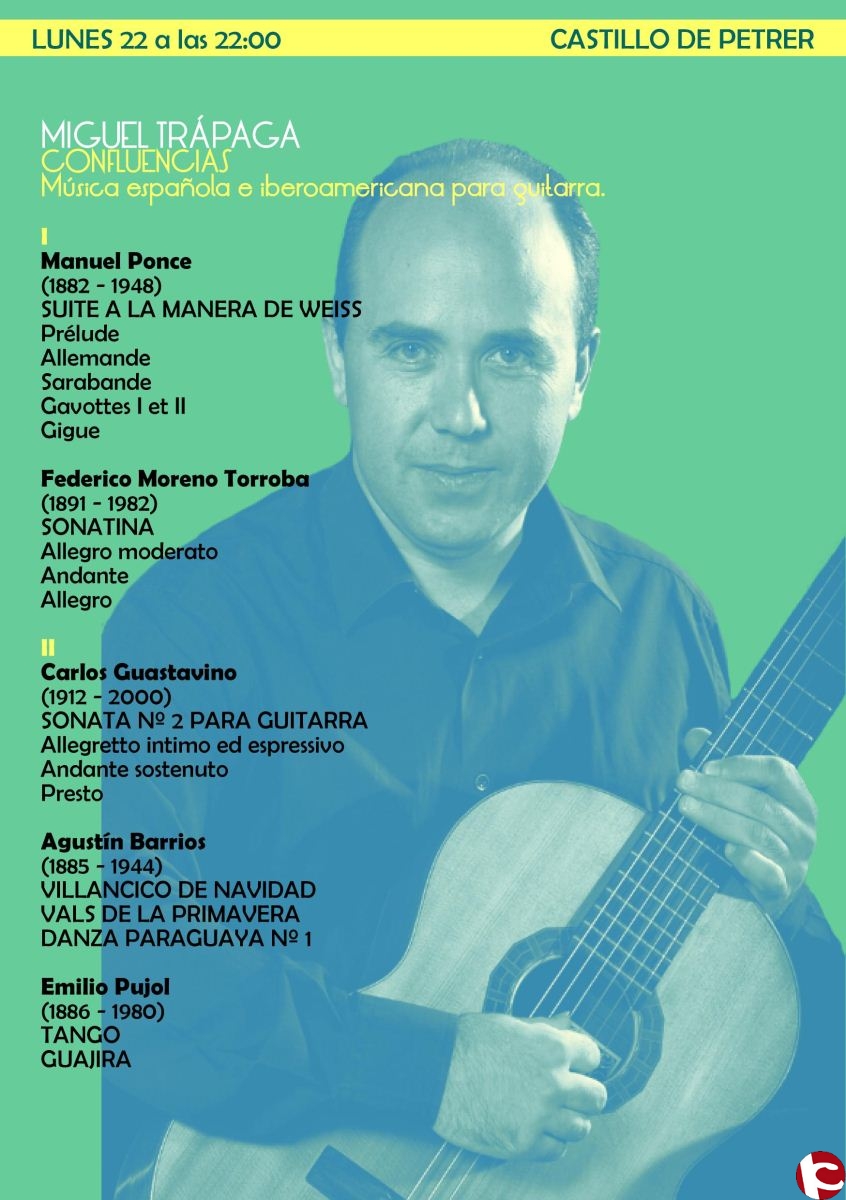 La 16 Semana de la Guitarra sigue su curso con la celebración de un nuevo concierto esta misma noche. Será en el Castillo de Petrer, a las 22:00 horas, con entrada gratuita y a cargo de Miguel Trápaga- profesor del guitarra del Real Conservatorio de Música de Madrid- que ofrecerá música española e iberoaméricana para guitarra en su concierto «Confluencias».