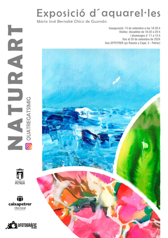 María José Bernabé Chico de Guzmán (@quatregatsimig en Instagram) nace en Petrer y desde pequeña muestra un gran interés por la pintura, siendo un motivo de evasión. Estudia Diseño Gráfico en la Escuela de Artes Aplicadas y Oficios Artísticos, si bien nunca se dedicó a la propia tarea de diseñar, pues ha trabajado en labores de carácter más comercial. Dos años antes de la pandemia dejó de trabajar y empezó con más dedicación su afición por la pintura, hasta tal punto que llegó un momento en el que el trabajo era tan abundante que se planteó dar a conocer su obra. Esta es su primera exposición y agradece a la Concejalía de Cultura, a la Obra Social de CaixaPetrer y al Grup Fotogràfic de Petrer su apoyo por hacerla posible. En la exposición se podrán ver alrededor de 50 obras en papel de acuarela con diferentes temáticas (botánica, retratos, paisajes, abstracciones…). La exposición estará abierta hasta el 29 de septiembre, los sábados de 18:30 a 20 h. y los domingos de 11 a 13 h.