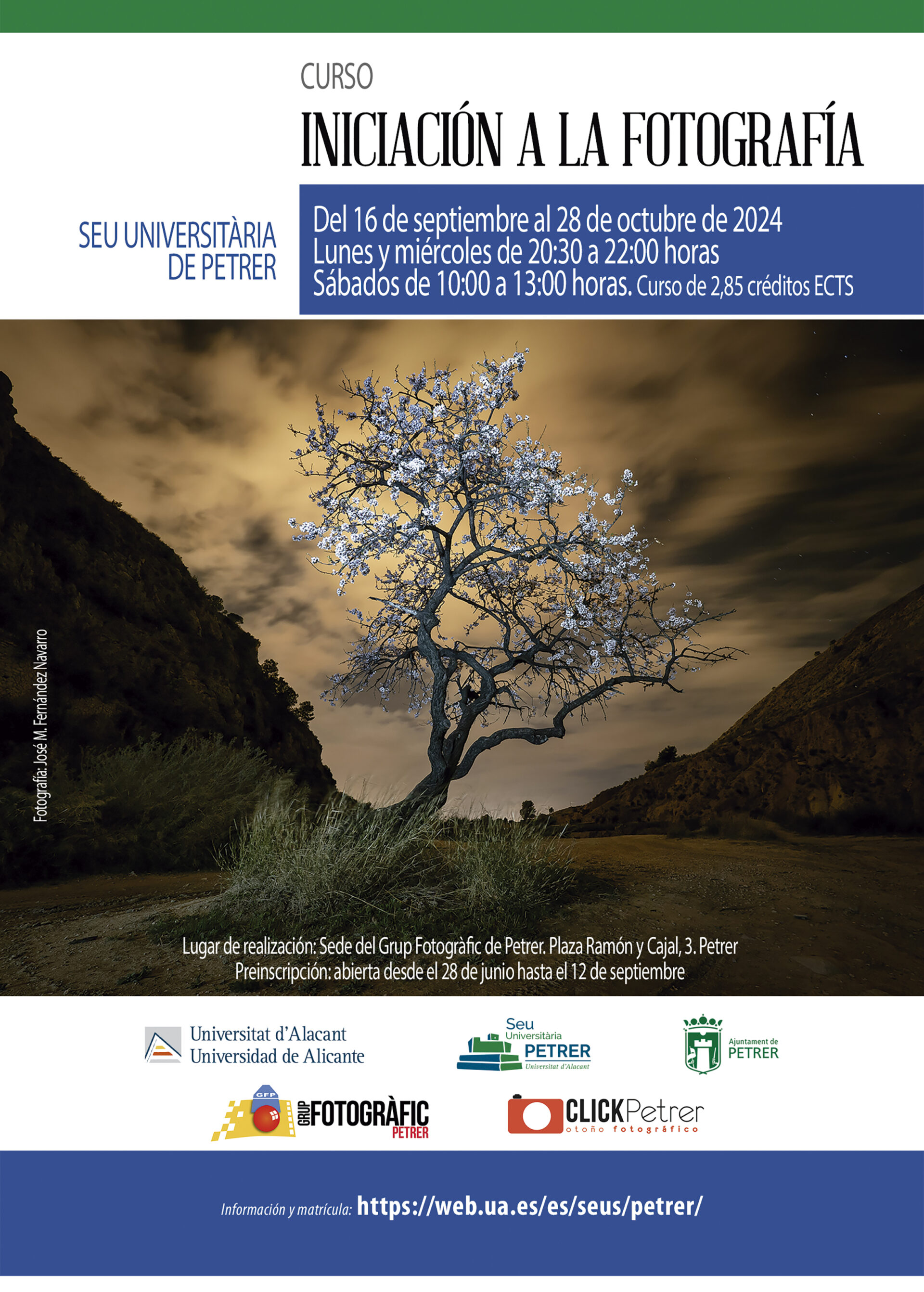 Por su parte, el 16 de septiembre de 2024 dará comienzo el XII Curso de Iniciación a la Fotografía organizado por el GFP junto a la Sede Universitaria de Petrer (SEU Petrer). Se trata de la quinta edición que llevan a cabo ambas entidades de manera conjunta y que quiere acercar la fotografía a todas las personas que estén interesadas por este lenguaje como medio de creación y comunicación. El curso consta de 15 sesiones entre teoría y práctica y será impartido por José Manuel Fernández Navarro y Francisco Pascual Maestre Martínez, miembros del GFP, y Enric Mira Pastor y Jorge Pulla González, profesores del Departamento de Comunicación y Psicología Social de la Universidad de Alicante. La preinscripción estará abierta hasta el 12 de septiembre. Las sesiones serán los lunes y miércoles en la sede del GFP de 20:30 a 22 h. y los sábados (prácticas) de 10 a 13 h. Desde la página web de la Sede Universitaria de Petrer se puede realizar la preinscripción del curso, así como toda la información del curso (precio, fechas, temario…).